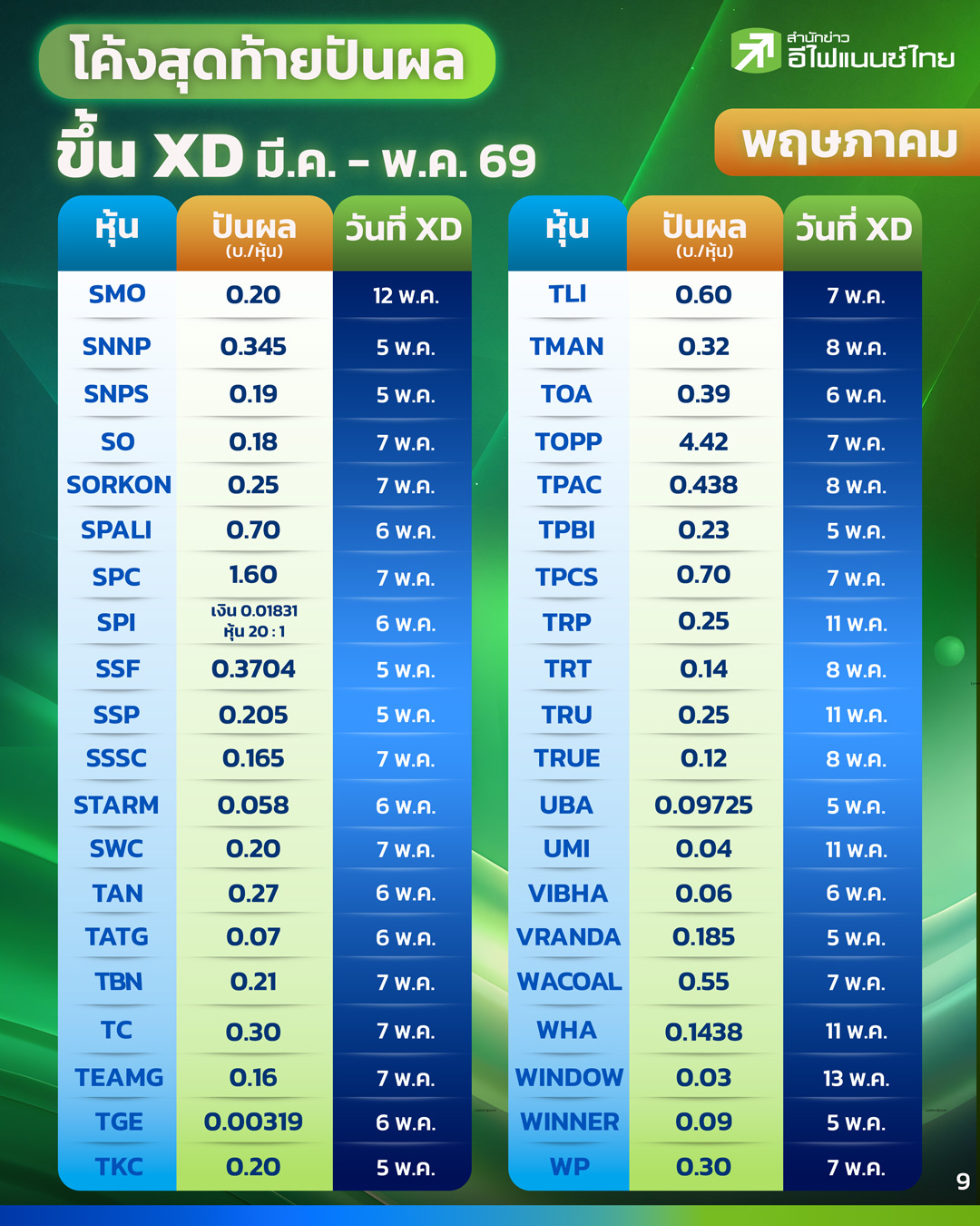 ส่วนเดือนพฤษภาคม เป็นอีกช่วงที่มีบริษัทจดทะเบียนประกาศจ่ายเงินปันผลจำนวนมาก โดยมีหุ้นที่จ่ายเงินปันผลในระดับโดดเด่น อาทิ TOP ที่จ่าย 4.42 บาทต่อหุ้น ขณะที่หุ้นกลุ่มสินค้าอุปโภคบริโภคอย่าง SPC จ่าย 1.60 บาทต่อหุ้น และบริษัทหลักทรัพย์จัดการกองทุนอย่าง MFC จ่าย 1.25 บาทต่อหุ้น รวมถึงหุ้นโรงแรมและท่องเที่ยวอย่าง CENTEL และ MINT ที่ยังคงมีการจ่ายเงินปันผลเช่นกัน