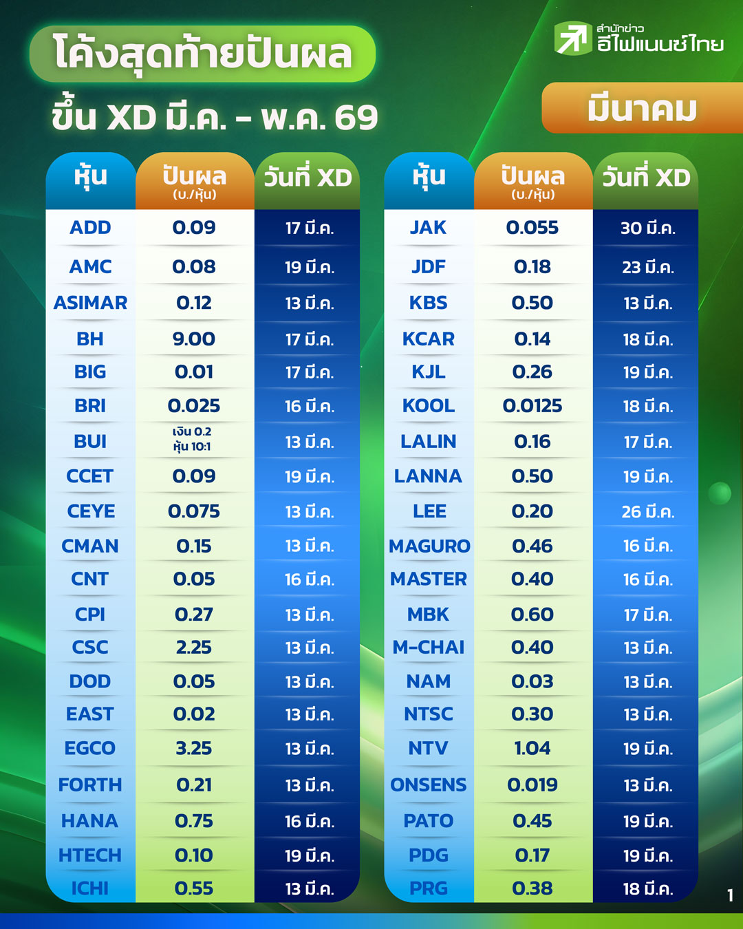 สำหรับเดือนมีนาคม มีหุ้นหลายตัวประกาศจ่ายเงินปันผลในระดับที่น่าสนใจ อาทิ BH ที่จ่ายสูงถึง 9 บาทต่อหุ้น ขณะที่หุ้นกลุ่มพลังงานอย่าง EGCO จ่าย 3.25 บาทต่อหุ้น รวมถึงหุ้นกลุ่มสินค้าเกษตรอย่าง TVO ที่จ่าย 1.17 บาทต่อหุ้น นอกจากนี้ยังมีหุ้นกลุ่มประกันและอุตสาหกรรมที่ประกาศจ่ายเงินปันผลในระดับใกล้เคียง 1 บาทต่อหุ้น สร้างความสนใจให้กับนักลงทุนสายรับกระแสเงินสด