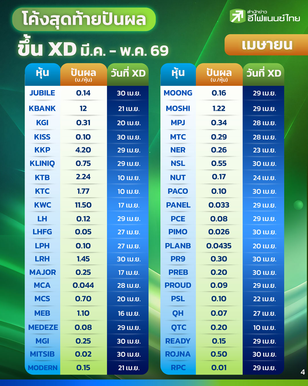 ขณะที่เดือนเมษายนถือเป็นช่วงที่หุ้นกลุ่มธนาคารพาณิชย์ทยอยขึ้นเครื่องหมาย XD ทั้ง KBANK ที่ประกาศจ่ายปันผล 12 บาทต่อหุ้น ตามมาด้วย BBL ที่จ่าย 8 บาทต่อหุ้น และ TISCO ที่จ่าย 5.75 บาทต่อหุ้น นอกจากนี้ยังมีหุ้นกลุ่มไฟแนนซ์อย่าง KKP ที่จ่าย 4.20 บาทต่อหุ้น รวมถึงหุ้นค้าปลีกขนาดใหญ่ เช่น CPALL และ CRC ที่ยังคงจ่ายเงินปันผลอย่างต่อเนื่อง