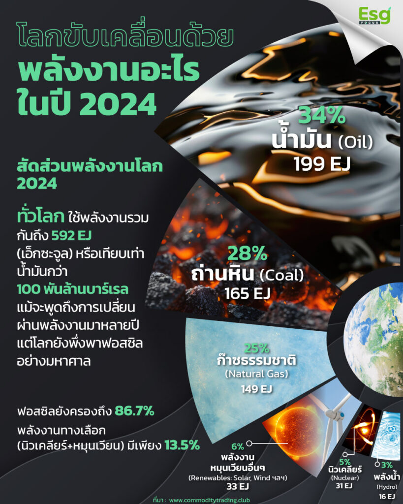 แม้โลกจะให้คำมั่นผ่านเวที COP มานับสิบปี เพื่อเร่งการเปลี่ยนผ่านสู่พลังงานสะอาด แต่ในปี 2024 โลกยังคงเดินด้วยน้ำมัน ถ่านหิน และก๊าซ พลังงานฟอสซิลที่เป็นเสมือน ‘อดีตที่ยังไม่จบ’ ยังคงถูกเผาเพื่อขับเคลื่อนอนาคตของมนุษย์ จากสถิติการขับเคลื่อนพลังงานที่ค้นหา โลกขับเคลื่อนด้วยพลังงานอะไรในปี 2024? ตำตอบในเชิงสถิติ ในปี 2024 ที่ผ่านมา พบว่า โลกทั้งใบยังคงหมุนไปด้วยพลังงานจากอดีต — ฟอสซิลที่เราพยายามจะเลิกใช้แต่ยังขาดไม่ได้ ตัวเลขจากรายงาน ล่าสุด เผยว่า มนุษยชาติใช้พลังงานรวมกว่า 592 เอ็กซะจูล (EJ) หรือเทียบเท่าน้ำมันมากกว่า