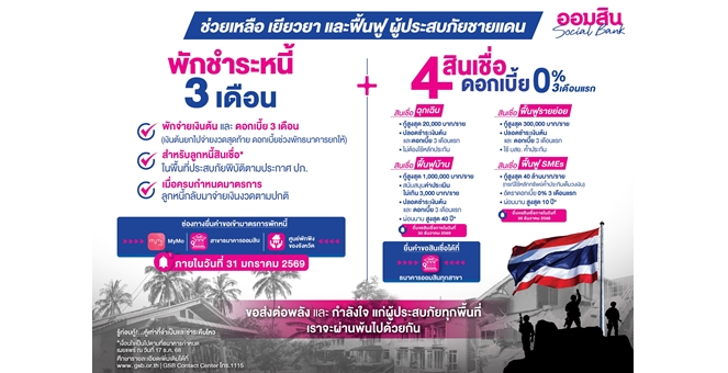 star_borderModal Upgrade Packageออมสิน จัดเต็มชุดมาตรการช่วยลูกหนี้ในพื้นที่ชายแดน พักหนี้ 3 เดือน - ดอกเบี้ยยกให้ สินเชื่อพิเศษ ดอกเบี้ย 0% ใน 3 เดือนแรก พร้อมจัดงบช่วยเหลือเฉพาะหน้าและงบเยียวยาครอบครัวผู้เสียชีวิต17 Dec 2025 10:53
