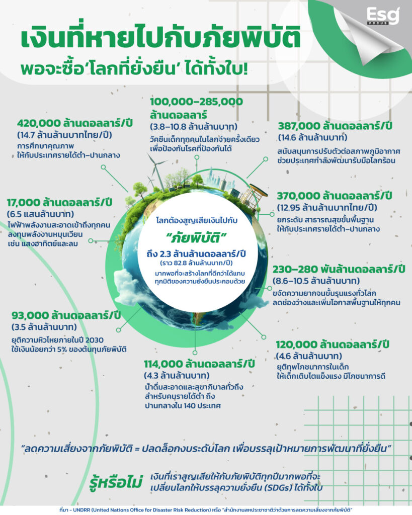 สหประชาชาติ (UNDRR) เผยโลกกำลังสูญเสียงบประมาณกว่า 2.3 ล้านล้านดอลลาร์ทุกปี เพื่อซ่อมความเสียหายจากภัยพิบัติ เงินจำนวนนี้มากพอจะสร้างโลกที่ยั่งยืนได้ทั้งใบ หากมนุษย์หันมา “ลงทุนเพื่อป้องกัน” แทนการ “ตามแก้” ถึงเวลาวางระบบป้องกันภัยที่ช่วยชีวิตผู้คน เศรษฐกิจ และอนาคตของโลก เมื่ออุณหภูมิโลกเพิ่มขึ้นเพียงไม่กี่องศา ผลที่ตามมากลับรุนแรงเกินคาด น้ำท่วม ดินถล่ม คลื่นความร้อน และไฟป่ากำลังลบล้างความก้าวหน้าทางการพัฒนาที่มนุษยชาติสั่งสมมาหลายทศวรรษให้หายไปในชั่วข้ามคืน อันโตนิโอ กูเตอร์เรส (Antonio Guterres)