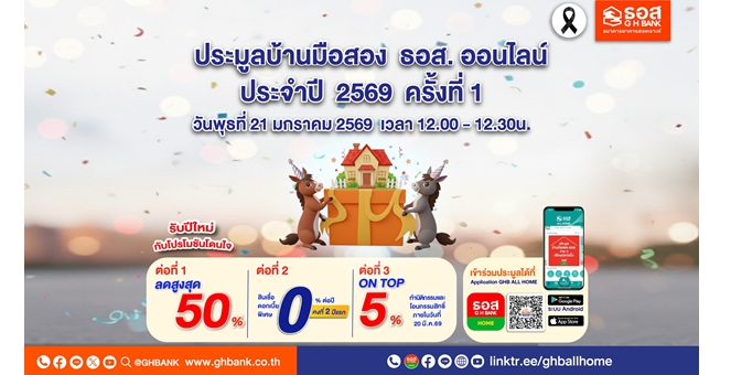star_borderModal Upgrade Packageธอส. ต้อนรับปีม้า จัดประมูลบ้านมือสองออนไลน์ ประจำปี 2569 ครั้งที่ 1 บ้านดี ทำเลเด่น ลดราคาสูงสุด 50% พร้อมโปรโมชันดอกเบี้ย 0% ต่อปี พบกันวันพุธที่ 21 มกราคม 256920 ม.ค. 2569 16:36 น.