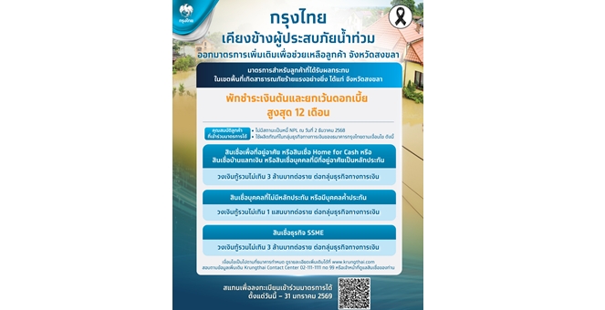 star_borderModal Upgrade Packageกรุงไทย ออกมาตรการเพิ่มเติมช่วยเหลือลูกค้าที่ได้รับผลกระทบจากน้ำท่วมรุนแรงในสงขลา พักชำระเงินต้นและยกเว้นดอกเบี้ยสูงสุด 12 เดือน12 ม.ค. 2569 11:32 น.