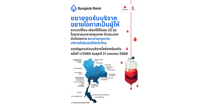 star_borderModal Upgrade Packageธนาคารกรุงเทพ ปลุกพลัง “ผู้ให้” เพิ่มจุดรับบริจาคโลหิตอีก 10 จุดเป็น 22 จุดทั่วประเทศ ในปี 2569 ส่งต่อพลังน้ำใจ สร้างความหวัง-ต่อชีวิตเพื่อนมนุษย์ ครั้งแรก! 21 มกราคมนี้12 ม.ค. 2569 11:56 น.