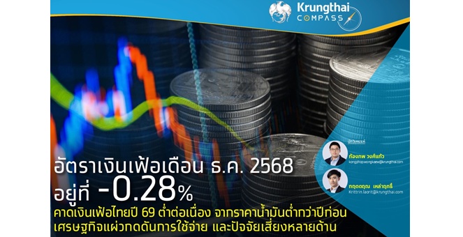 • Krungthai COMPASS เผยอัตราเงินเฟ้อเดือน ธ.ค. 68 อยู่ที่ -0.28% คาดเงินเฟ้อไทยปี 69 ต่ำต่อเนื่อง จากราคาน้ำมันต่ำกว่าปีก่อน เศรษฐกิจแผ่วกดดันการใช้จ่ายและปัจจัยเสี่ยงหลายด้าน