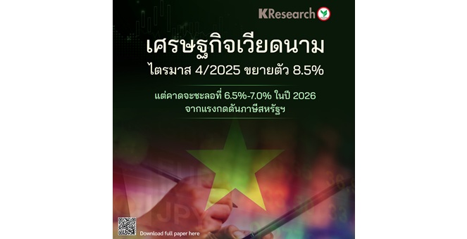 • ศูนย์วิจัยกสิกรไทย เผยเศรษฐกิจเวียดนามไตรมาสที่ 4/2025 ขยายตัว 8.5% แต่คาดชะลอที่ 6.5%-7.0% ในปี 2026 จากแรงกดดันภาษีสหรัฐฯ