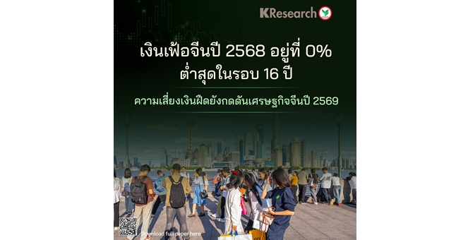 • ศูนย์วิจัยกสิกรไทย เผยเงินเฟ้อจีนปี 2568 อยู่ที่ 0% ต่ำสุดในรอบ 16 ปี ความเสี่ยงเงินฝืดยังกดดันเศรษฐกิจจีนปี 2569