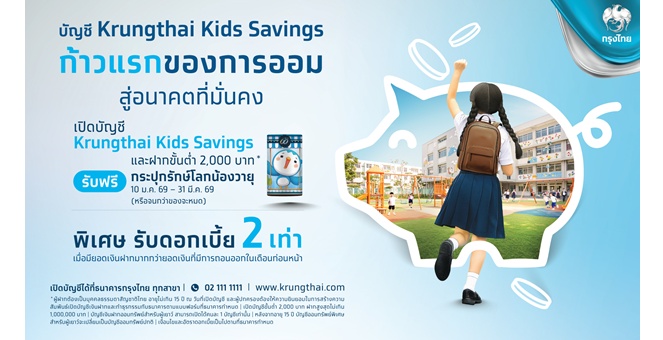 star_borderModal Upgrade Packageกรุงไทยมอบของขวัญวันเด็ก เริ่มต้นก้าวแรกการออม ด้วยบัญชี Krungthai Kids Savings รับดอกเบี้ย และโบนัสรวมเป็น 2 เท่า พร้อมกระปุกน้องวายุ8 ม.ค. 2569 13:07 น.