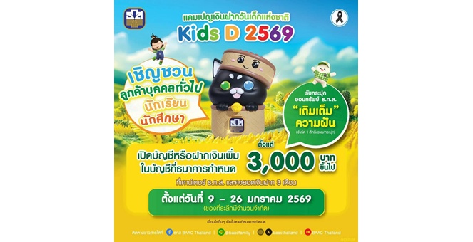 star_borderModal Upgrade Packageธ.ก.ส. ชวนน้องๆ ออมเงินขั้นต่ำเพียง 3,000 บาทขึ้นไป รับกระปุก “เติมเต็ม ความฝัน” สุดคิวต์ ผ่านแคมเปญเงินฝากวันเด็กแห่งชาติ “Kids D 2569”7 ม.ค. 2569 10:22 น.