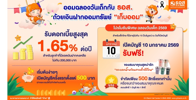 star_borderModal Upgrade Packageธอส. ชวนออมฉลองวันเด็ก กับ เงินฝากออมทรัพย์ “เก็บออม” รับดอกเบี้ยสูงสุด 1.65% ต่อปี พิเศษ! เปิดบัญชีวันเสาร์ที่ 10 มกราคม 2569 รับของสมนาคุณฟรี7 ม.ค. 2569 11:31 น.