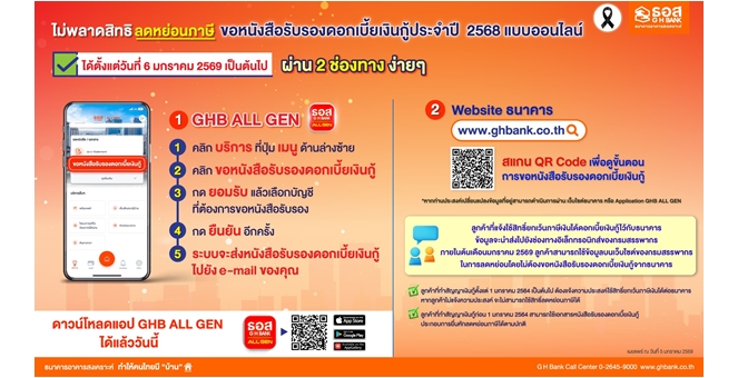 star_borderModal Upgrade Packageไม่พลาดสิทธิลดหย่อนภาษี! ขอหนังสือรับรองดอกเบี้ยเงินกู้ได้ง่ายๆ กับ ธอส.ผ่าน Application : GHB ALL GEN และ www.ghbank.co.th ตั้งแต่วันที่ 6 มกราคม 2569 เป็นต้นไป5 ม.ค. 2569 18:37 น.