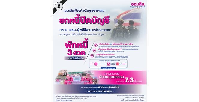 star_borderModal Upgrade Packageออมสิน เคียงข้างวีรบุรุษชายแดน ประกาศ “ยกหนี้ปิดบัญชี” ทหาร - ตชด. ผู้พลีชีพ รวมถึงหนี้ของทายาท26 ธ.ค. 2568 13:06 น.