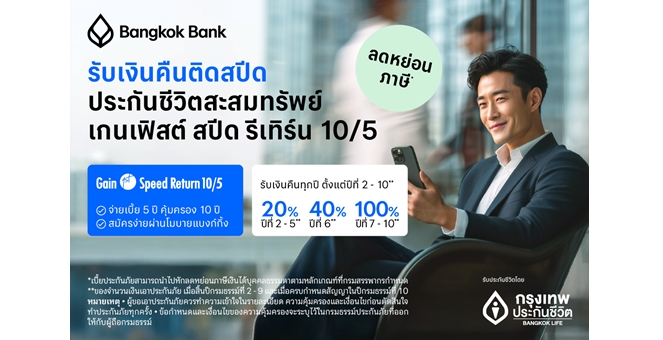 star_borderModal Upgrade Packageกรุงเทพประกันชีวิต ร่วมกับธนาคารกรุงเทพ เปิดแผนประกันชีวิตใหม่ เกนเฟิสต์ สปีด รีเทิร์น 10/5 ชูจุดเด่นอัตราผลตอบแทนสูง รับเงินคืนไวในระหว่างสัญญา17 ธ.ค. 2568 15:52 น.