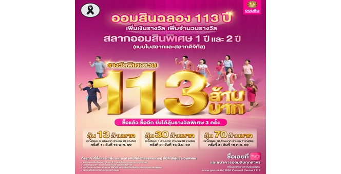 star_borderModal Upgrade Packageออมสิน ฉลอง 113 ปี เพิ่มจำนวนรางวัล เพิ่มเงินรางวัล รวม 113 ล้านบาท ให้ลูกค้าสลากออมสินได้ลุ้นโชคถึง 3 ครั้ง ยิ่งซื้อยิ่งได้ลุ้น จับรางวัลครั้งแรก 16 พ.ค.26 Mar 2026 18:01