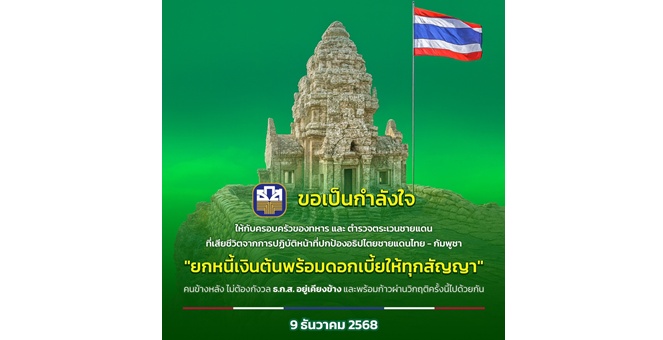 star_borderModal Upgrade Packageธ.ก.ส. เร่งช่วยเหลือทหาร และ ตชด. ที่เสียชีวิตจากการปกป้องอธิปไตยชายแดนไทย – กัมพูชา ยกหนี้เงินต้นพร้อมดอกเบี้ยทุกสัญญาเงินกู้9 ธ.ค. 2568 11:13 น.