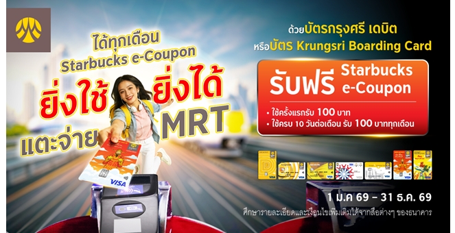star_borderModal Upgrade Packageแตะจ่าย รถไฟฟ้า MRT ด้วยบัตรกรุงศรี เดบิต หรือบัตร Krungsri Boarding Card รับฟรี Starbucks e-Coupon มูลค่า 100 บาท ทุกเดือน25 มี.ค. 2569 15:59 น.