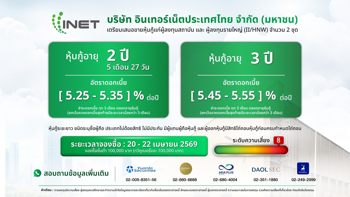 star_borderModal Upgrade PackageINET เตรียมเสิร์ฟหุ้นกู้ 2 ชุด ดอกเบี้ยคงที่ [5.25 - 5.55] % ต่อปี18 มี.ค. 2569 17:25 น.