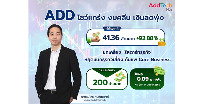 star_borderModal Upgrade PackageADD โชว์สถานะแกร่ง งบคลีน เงินสดพุ่ง เสิร์ฟปันผล 0.09 บาทต่อหุ้น พร้อม XD 17 มี.ค. นี้ ประกาศ `รีสตาร์ทธุรกิจ` หยุดแบกธุรกิจเสี่ยง คืนชีพ Core Business10 มี.ค. 2569 14:42 น.