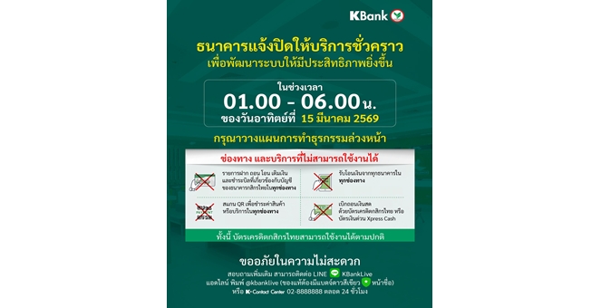 star_borderModal Upgrade Packageกสิกรไทย แจ้งปิดปรับปรุงระบบชั่วคราว ช่วง 01:00 - 06:00 น. ของวันที่ 15 มี.ค. 6910 มี.ค. 2569 10:34 น.