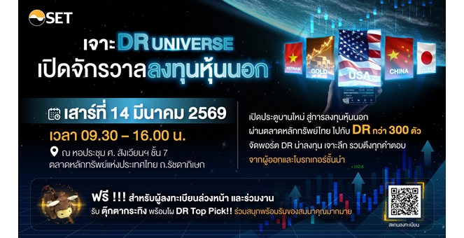 star_borderModal Upgrade Packageตลาดหลักทรัพย์ฯ ชวนร่วมสัมมนา “เจาะ DR Universe เปิดจักรวาลลงทุนหุ้นนอก” เสาร์ที่ 14 มี.ค. นี้10 มี.ค. 2569 10:52 น.
