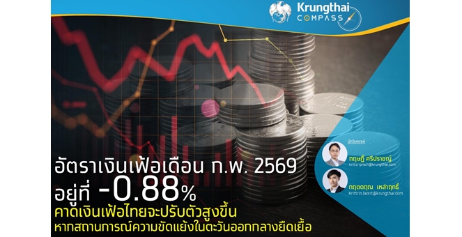 star_borderModal Upgrade PackageKrungthai COMPASS เผยอัตราเงินเฟ้อเดือน ก.พ. 69 อยู่ที่ -0.88% คาดเงินเฟ้อไทยจะปรับตัวสูงขึ้น หากสถานการณ์ความขัดแย้งในตะวันออกกลางยืดเยื้อ10 มี.ค. 2569 12:59 น.