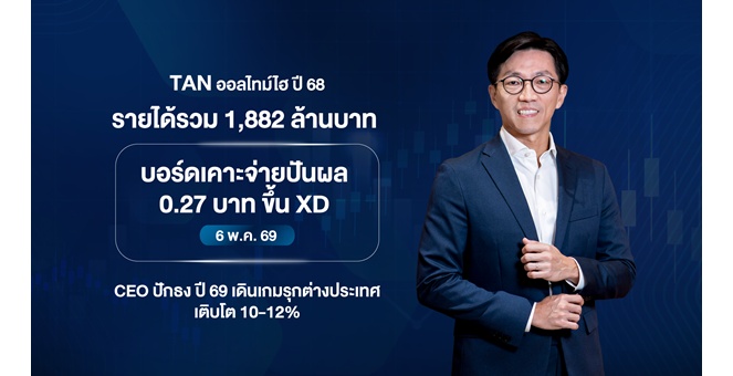 star_borderModal Upgrade PackageWP ไม่ธรรมดา! รายได้ปี 68 แตะ 17,546 ลบ. – กำไรสุทธิ 154 ลบ. บอร์ดไฟเขียวจ่ายปันผล 0.30 บ./หุ้น รับเงิน 22 พ.ค.นี้ ปี 69 ปักธงยอดขาย 7.7 แสนตัน ทุ่มงบลงทุน 500 ลบ. หนุนอนาคตมั่นคง25 ก.พ. 2569 16:08 น.