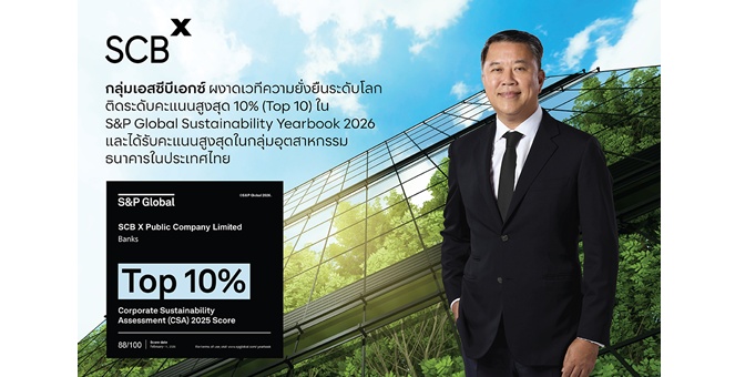 star_borderModal Upgrade Packageกลุ่มเอสซีบีเอกซ์ ผงาดเวทีความยั่งยืนระดับโลก ติดระดับคะแนนสูงสุด 10% (Top 10) ใน S&P Global Sustainability Yearbook 2026 และได้รับคะแนนสูงสุดในกลุ่มอุตสาหกรรมธนาคารในประเทศไทย20 ก.พ. 2569 11:44 น.