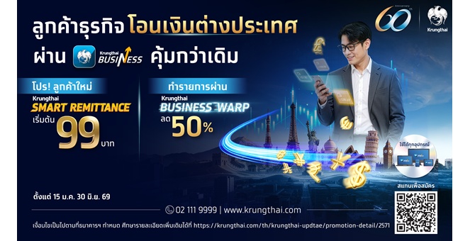 star_borderModal Upgrade Packageกรุงไทยหนุนผู้ประกอบการนำเข้า-ส่งออก จัดโปรฯ โอนเงินต่างประเทศ ค่าธรรมเนียมสุดคุ้ม เริ่มต้นเพียง 99 บาท เมื่อทำรายการผ่าน Krungthai BUSINESS19 ก.พ. 2569 09:59 น.