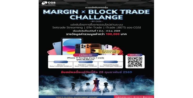 star_borderModal Upgrade PackageCGSI ปลุกพลังนักลงทุน เปิดศึก “Margin x Block Trade Challenge” เวทีประลองกลยุทธ์การลงทุน ชิงรางวัลรวมกว่า 1 แสนบาท16 ก.พ. 2569 12:34 น.