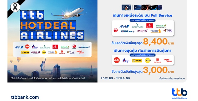 star_borderModal Upgrade Packageบัตรเครดิต ttb เปิดดีลบินสุดคุ้มรับต้นปี มอบเครดิตเงินคืนสูงสุด 8,400 บาท เมื่อซื้อตั๋วเครื่องบิน 15 สายการบินชั้นนำ6 ก.พ. 2569 11:17 น.