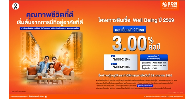 star_borderModal Upgrade Packageธอส. ใส่ใจสุขภาพลูกค้าและประชาชนควบคู่กับการมีบ้านเป็นของตนเอง จัดทำสินเชื่อ Well Being ปี 2569 อัตราดอกเบี้ย 2 ปีแรกเพียง 3.00 % ต่อปีเท่านั้น26 ม.ค. 2569 14:48 น.